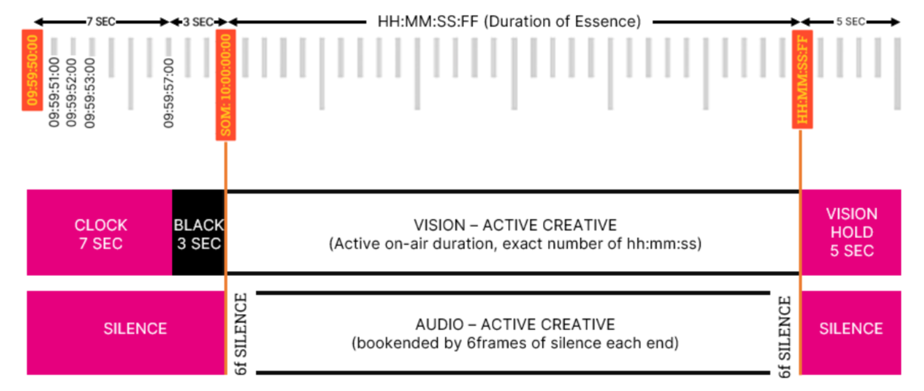 There should be 6 frames of audio silence at the start and end of the item and the duration should not exceed the stated length. At the end of the item, there should be either a 0-second hold (i.e. the video ends immediately after the creative) or 5-second hold on vision, completely still (No ‘Living Freezes’ or animations). A single commercial or Sponsorship asset will always be played out from the start of the message (SOM) to the endpoint without interruption. The IN-point (SOM) and DURATION for the continuous playback section must be included with the delivery metadata. As per the diagram below, “DURATION OF ESSENCE" does not include the 5-second hold if added.